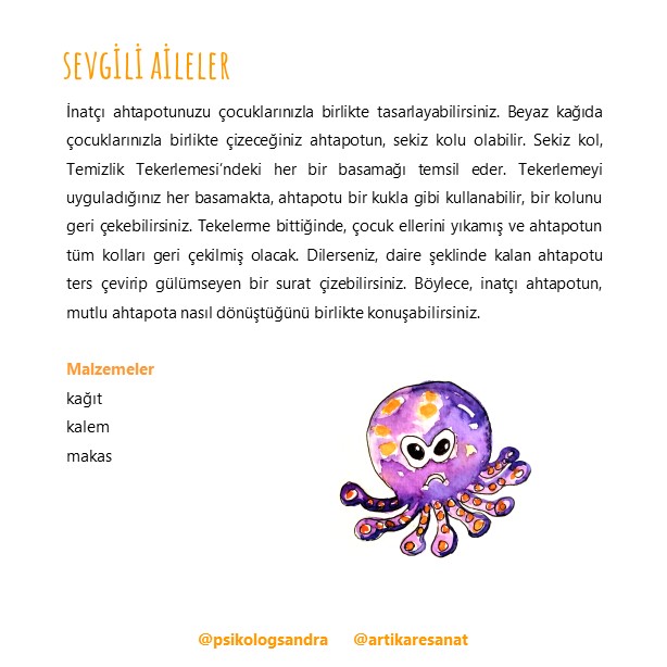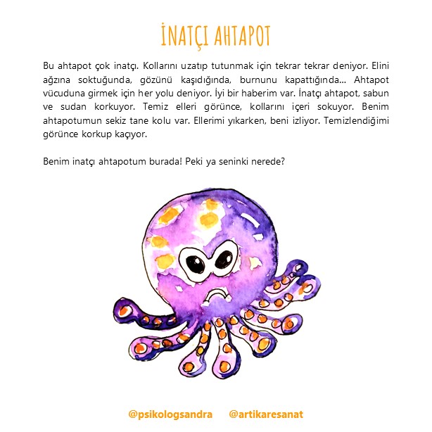 Global-Child EMDR Alliance, Uzm. Psk. Sandra Pasensya ve Ressam Filiz Kiprik işbirliği ile hayata geçirilen proje, özel gelişimde olan çocukların virüs kavramını anlamlandırmaları, el yıkama çizelgesinin takibini sağlamaları ve sürecin geliştirdiği olumsuz duygular ile kalabilmeyi ve inatçı ahtapotun nasıl mutlu olabileceğini keşfetmeleri için eşsiz bir materyal halini aldı.